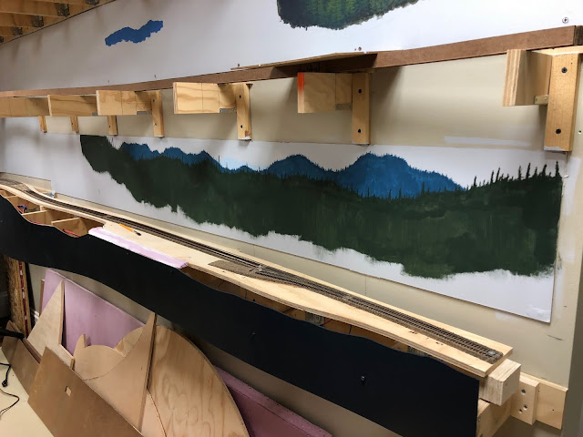 In a previous post 2 weeks ago I discussed establishing a "base" on the backdrop for further detailing and scenery development. In Oakridge, a town that is surrounded by prominent hills, I wanted to take some time to work on developing my base painting at a higher level of detail, specifically detailing the prominent features in the background before I move on to any foreground painting.